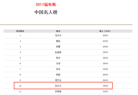 2017福布斯中国名人榜显示,当年吴亦凡的年收入达1.5亿,排在榜单的第十位。2020福布斯中国名人榜,吴亦凡更进一步,排到了榜单的第8位,不过2020年的榜单并没有透露名人的收入情况。