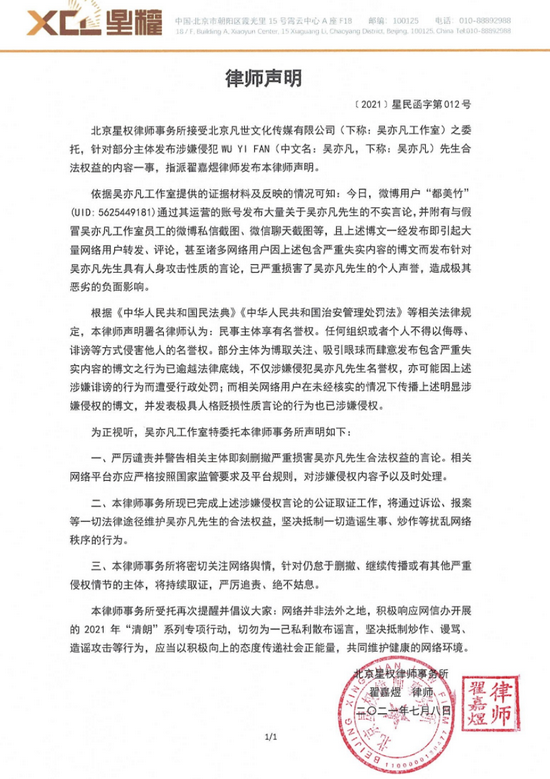 7月8日,北京星权律师事务所发布律师声明,称都美竹发布大量关于吴亦凡的不实言论,并附有假冒吴亦凡工作室员工的微博私信截图、微信聊天截图等,声明称其行为已严重损害吴亦凡的个人声誉。