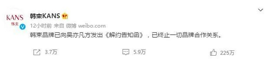18日晚间,韩束发文表示,已向吴亦凡方发出《解约告知函》并终止一切品牌合作关系。
