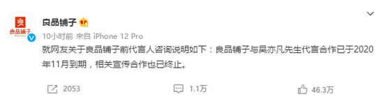 其中,良品铺子发微博称,与吴亦凡的合作已经于去年11月到期。