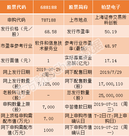 柏楚电子此次发行总数2500万股,网上发行712.5万股,发行市盈率50.19倍,申购代码为:787188,发行价格:68.58元,单一帐户申购上限7000股,申购数量为500股整数倍,网上顶格申购需配市值7万元。