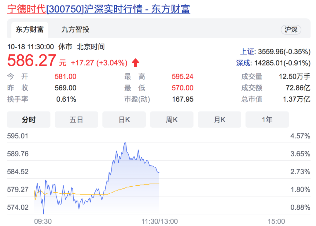 10月18日早盘,宁德时代股价再次上涨,一度涨2%至585.97元/股,股价创历史记录新高,总市值超13500亿。截午间收盘,宁德时代股报586.27元/股,涨3.04%,最新市值为13700亿元