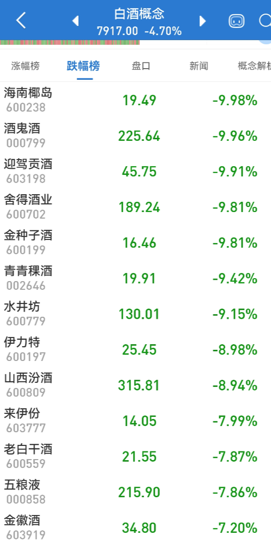 A股早盘,白酒板块全线重挫。海南椰岛尾盘跌停,舍得酒业、水井坊、迎驾贡酒、酒鬼酒跌逾9%,五粮液、山西汾酒跌逾7%,贵州茅台跌超5%。